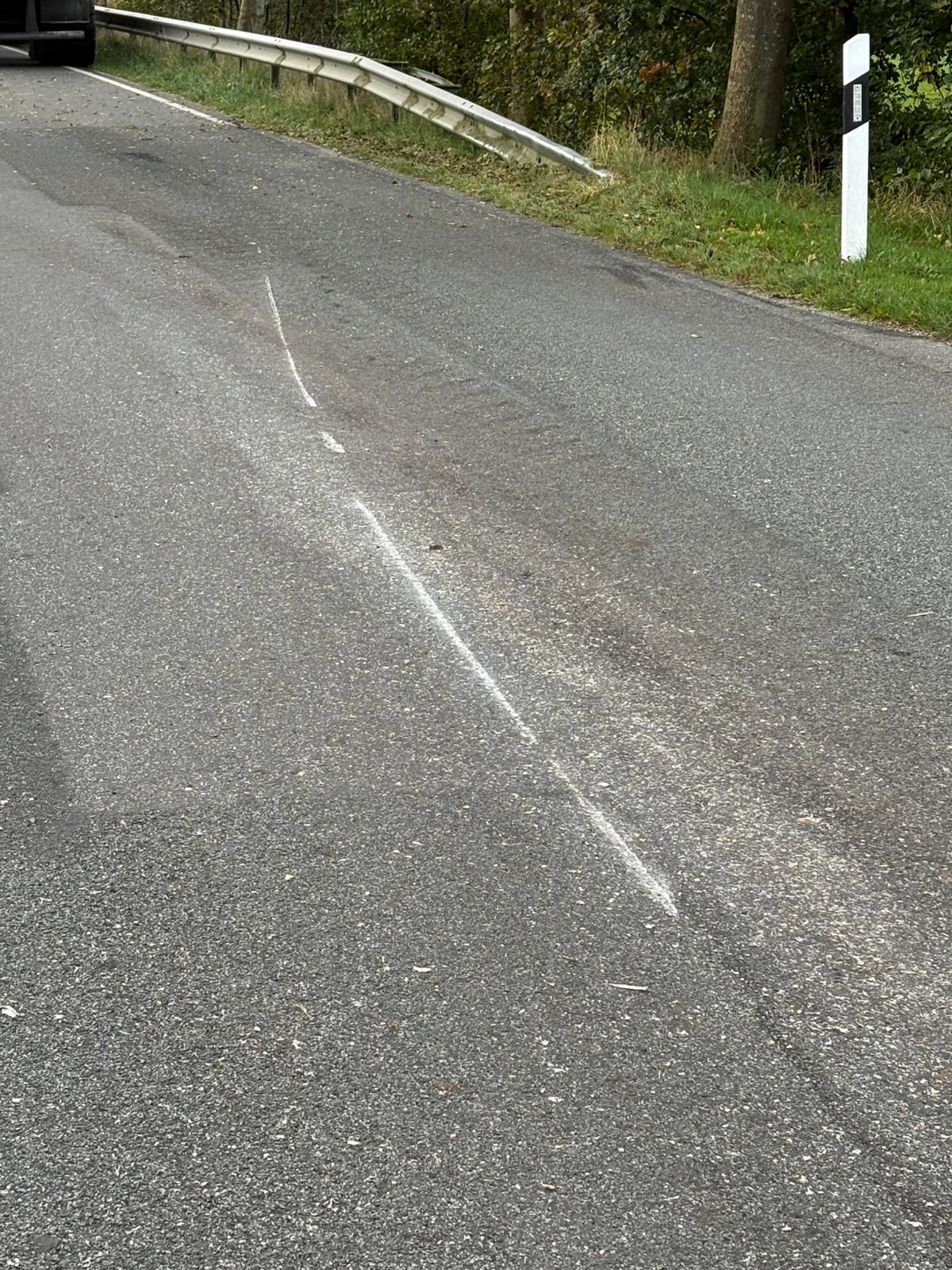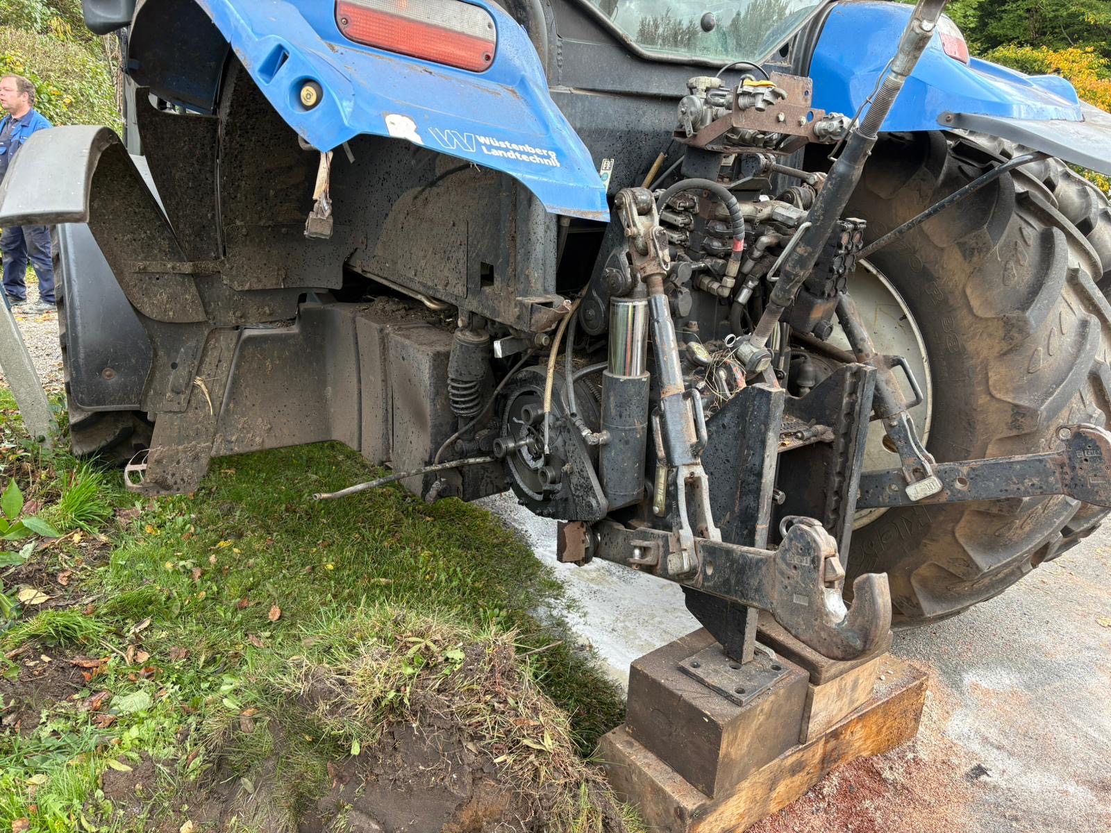 Durch die Kollision war bei einem Traktor das linke Hinterrad abgerissen und hatte dort verlaufende Hydraulikleitungen beschädigt. Dieser Traktor war auf dem Grünstreifen eines Grundstückes zum Stehen gekommen und hatte eine mehrere Meter lange Ölspur hinterlassen.
