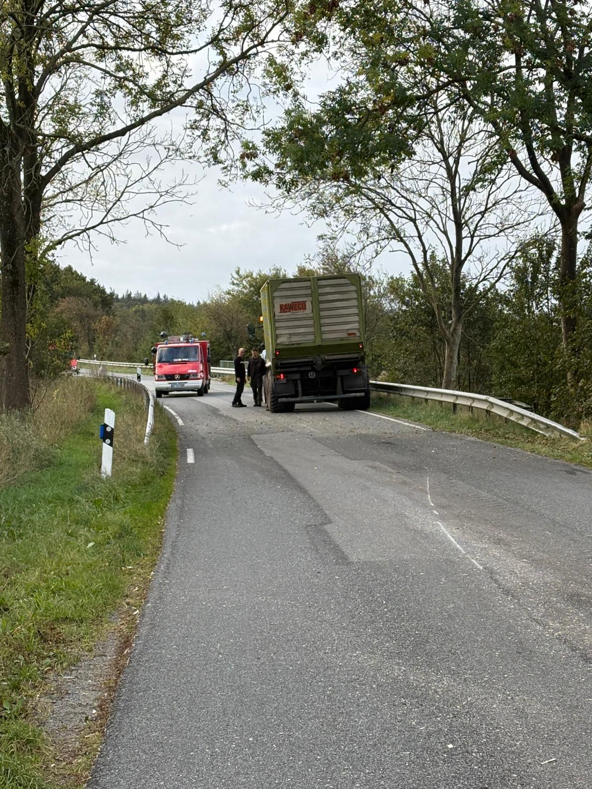 Die Fahrzeuge blockierten die gesamte L14 im Bereich der Unfallstelle. Die zu erst alarmierte FF Kleinwiehe hat als Erstmaßnahme die Unfallstelle komplett für den Verkehr gesperrt und begonnen das ausgelaufene Hydrauliköl mit Ölbindemittel zu binden.